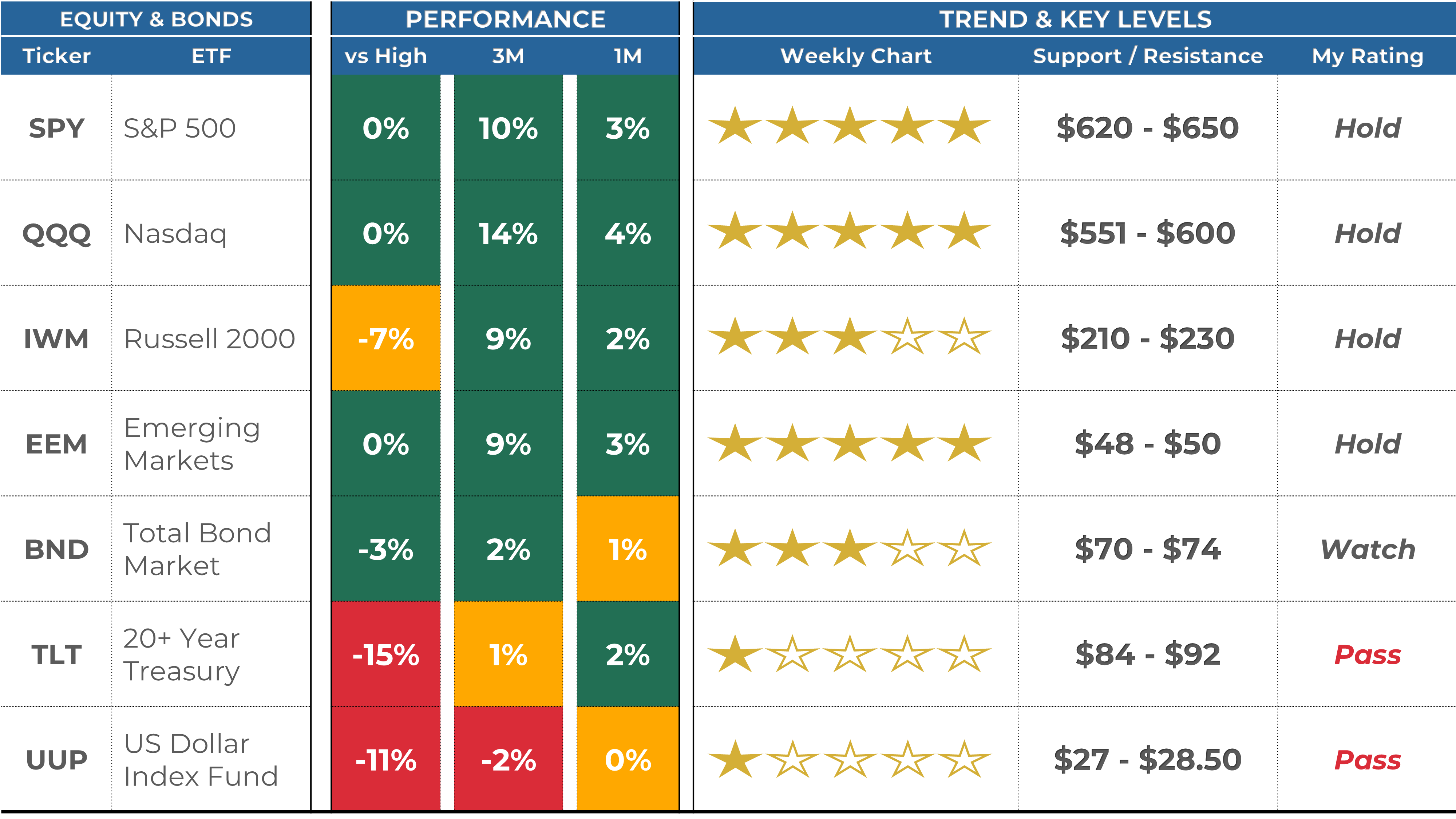 I assess the strength of a ETF’s weekly chart using a trend rating system on a scale of 1 to 5. A score of 3 or above indicates a strong trend worth holding. A score of 2 or below signals weakening momentum and suggests preparing an exit plan.