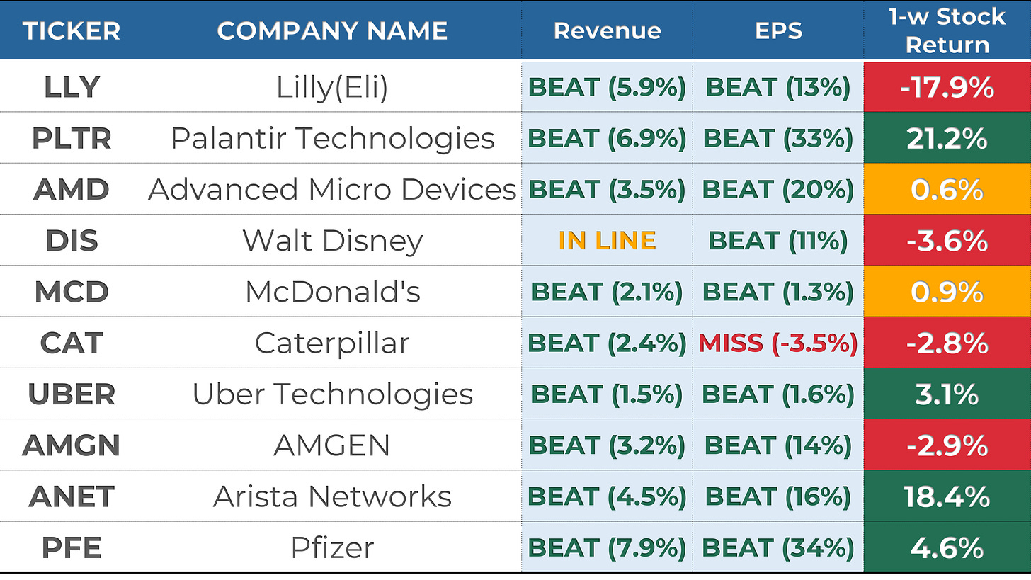 Below are some notable companies that reported earnings last week. I’ve highlighted their EPS and revenue performance vs estimate, as well as their stock return this week.
