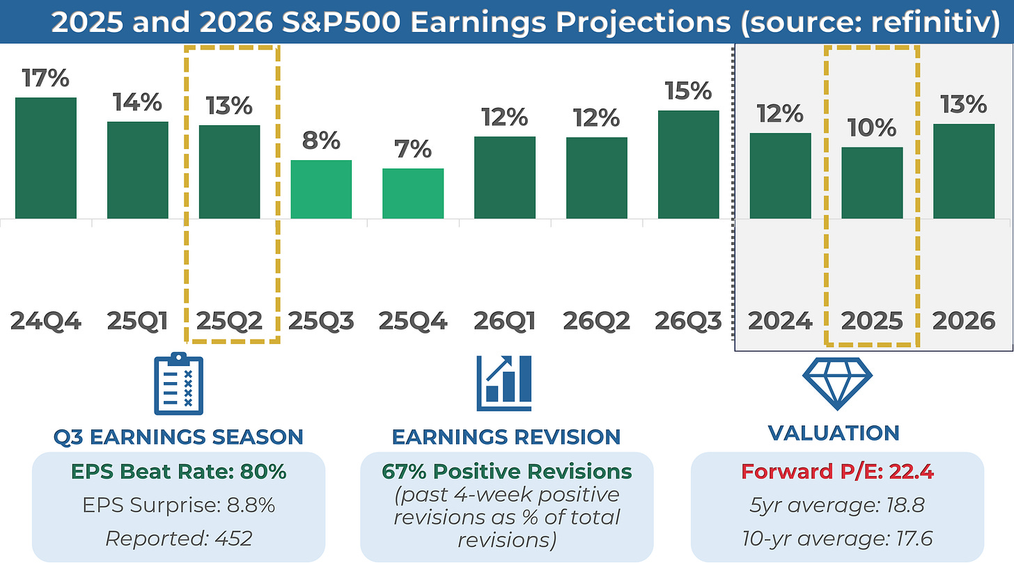 3. The Q2 earnings season is underway and 452 companies from the S&P 500 index have released their quarterly results, with 80% beating estimates. Earnings are expected to be up 13% in Q2 and 10% in 2025.