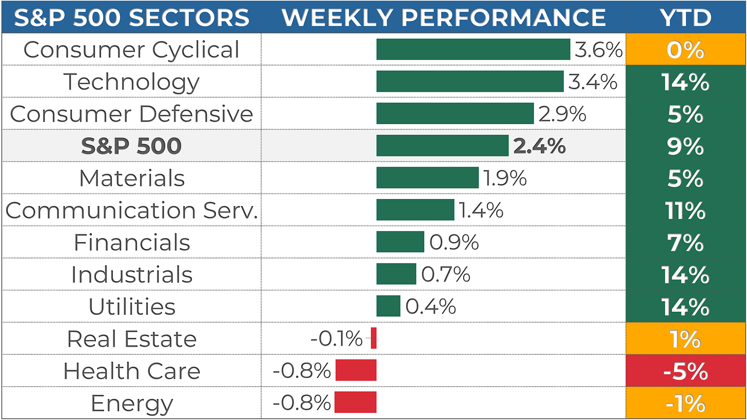 1. The markets were positive this week, with the S&P 500 up 2.4%, the Nasdaq 3.9%, and the Dow Jones 1.4%. Consumer Cyclical (+3.6%) and Technology (+3.4%) were the best-performing sectors.