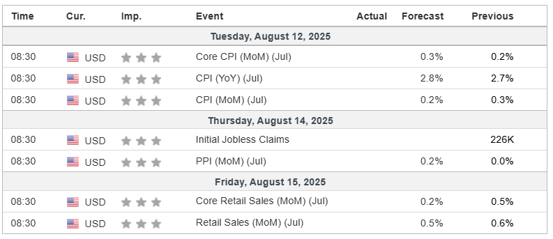 Retail Sales (Fri): Core retail sales are forecast to rise 0.2% MoM, with overall sales also expected up 0.5%. The data will test the strength of consumer demand in July.