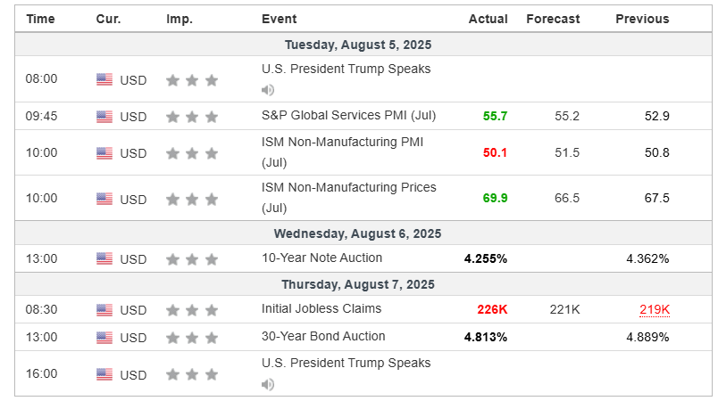 ISM Non-Manufacturing PMI (Tue): Fell to 50.1, below the forecast (51.5) and just above the contraction threshold.