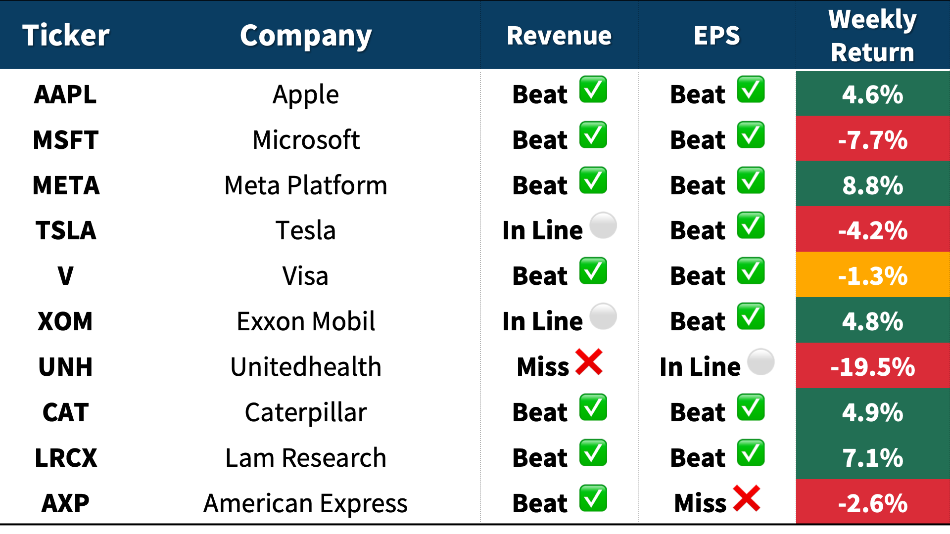 Below are some notable companies that reported last week, along with their EPS/revenue performance vs. estimates and weekly stock returns.