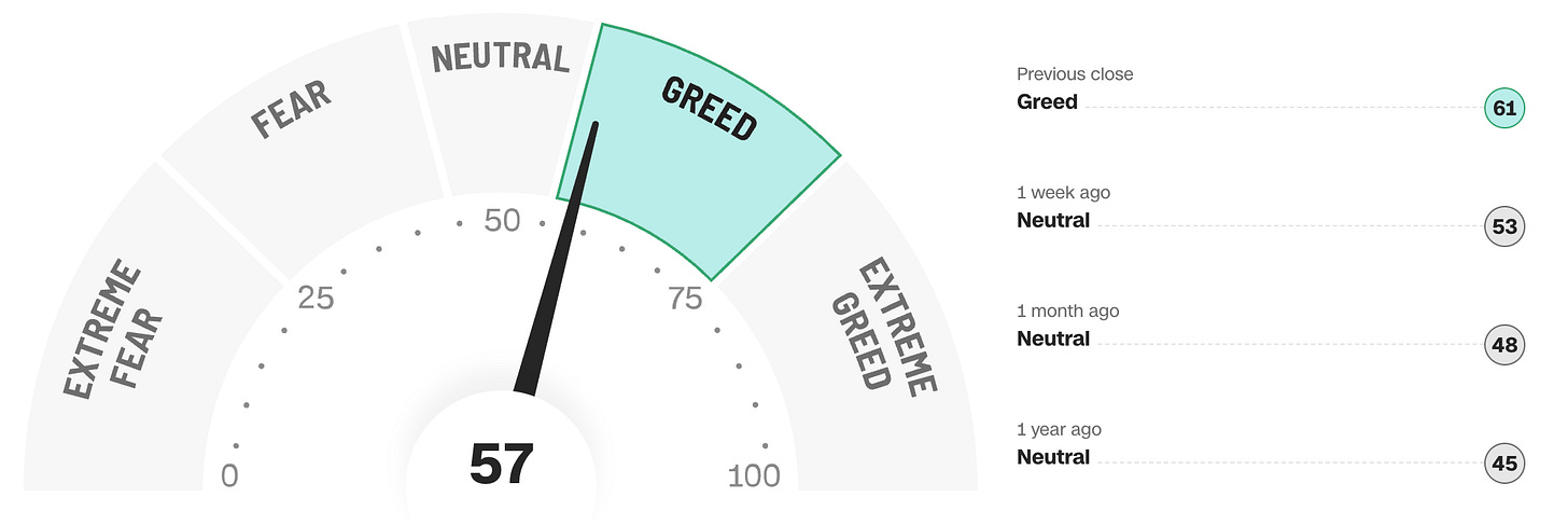 4. Sentiment Check: CNN Fear & Greed at 57/100 (Greed); VIX was up to 17.4, a low reading.
