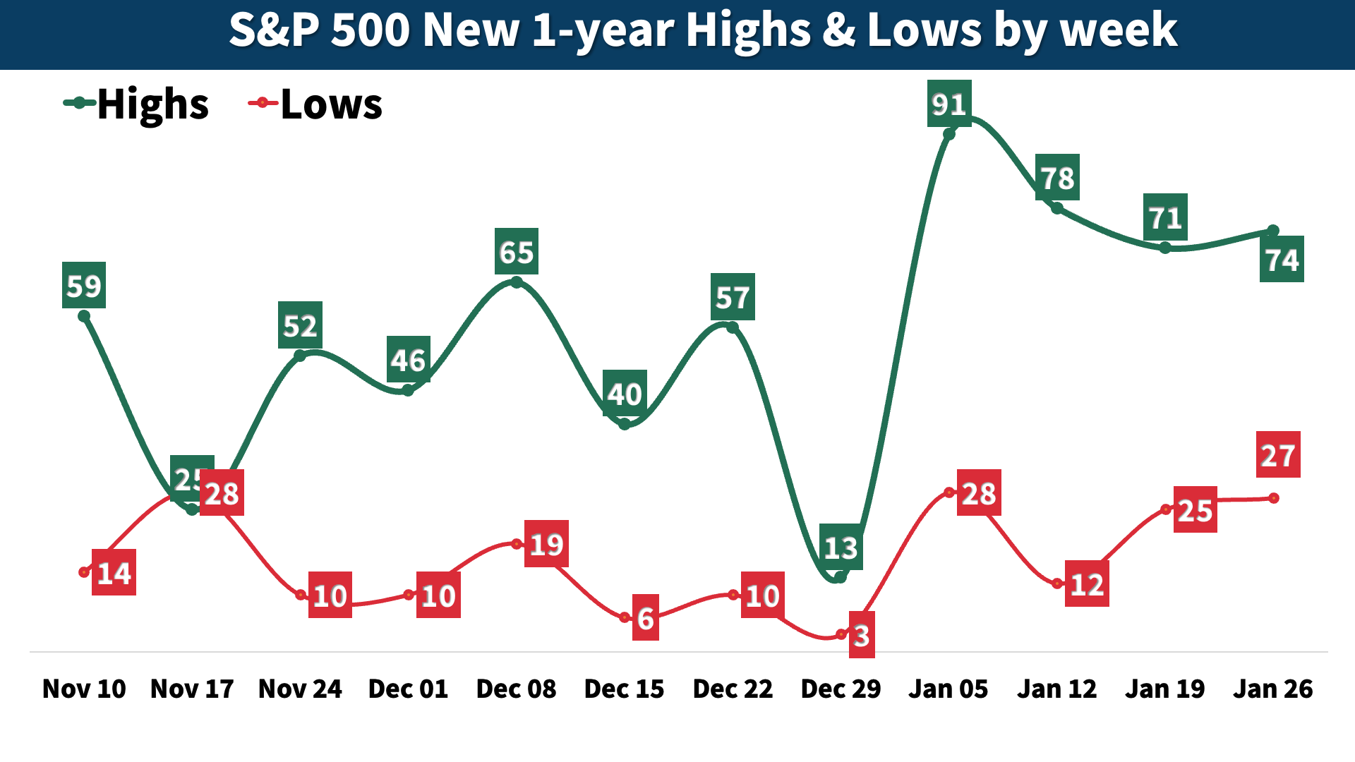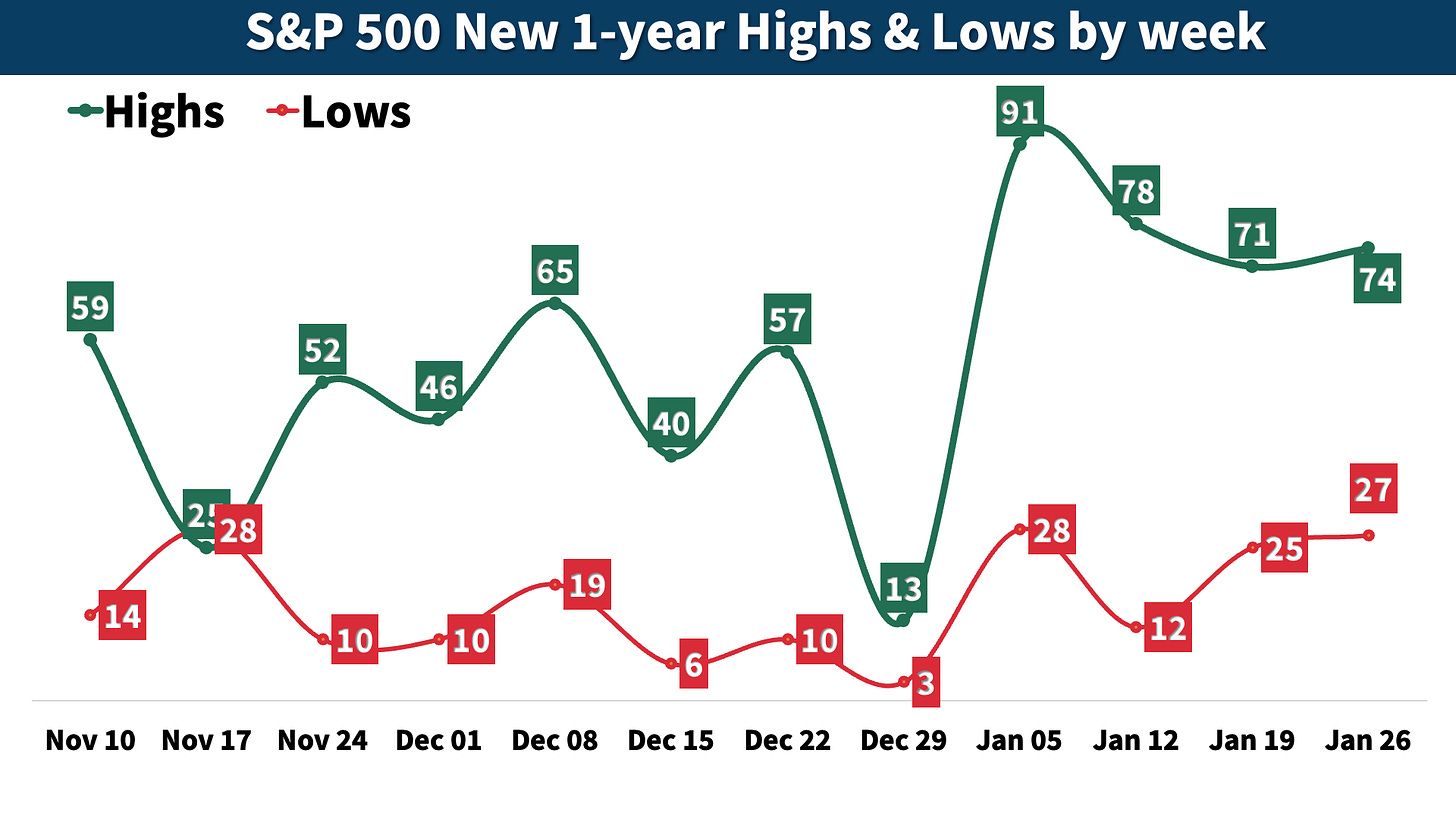 This week, 74 S&P 500 stocks hit new 52-week highs, while 27 stocks fell to new lows. Industrials stood out, contributing 21 of this week’s new highs.