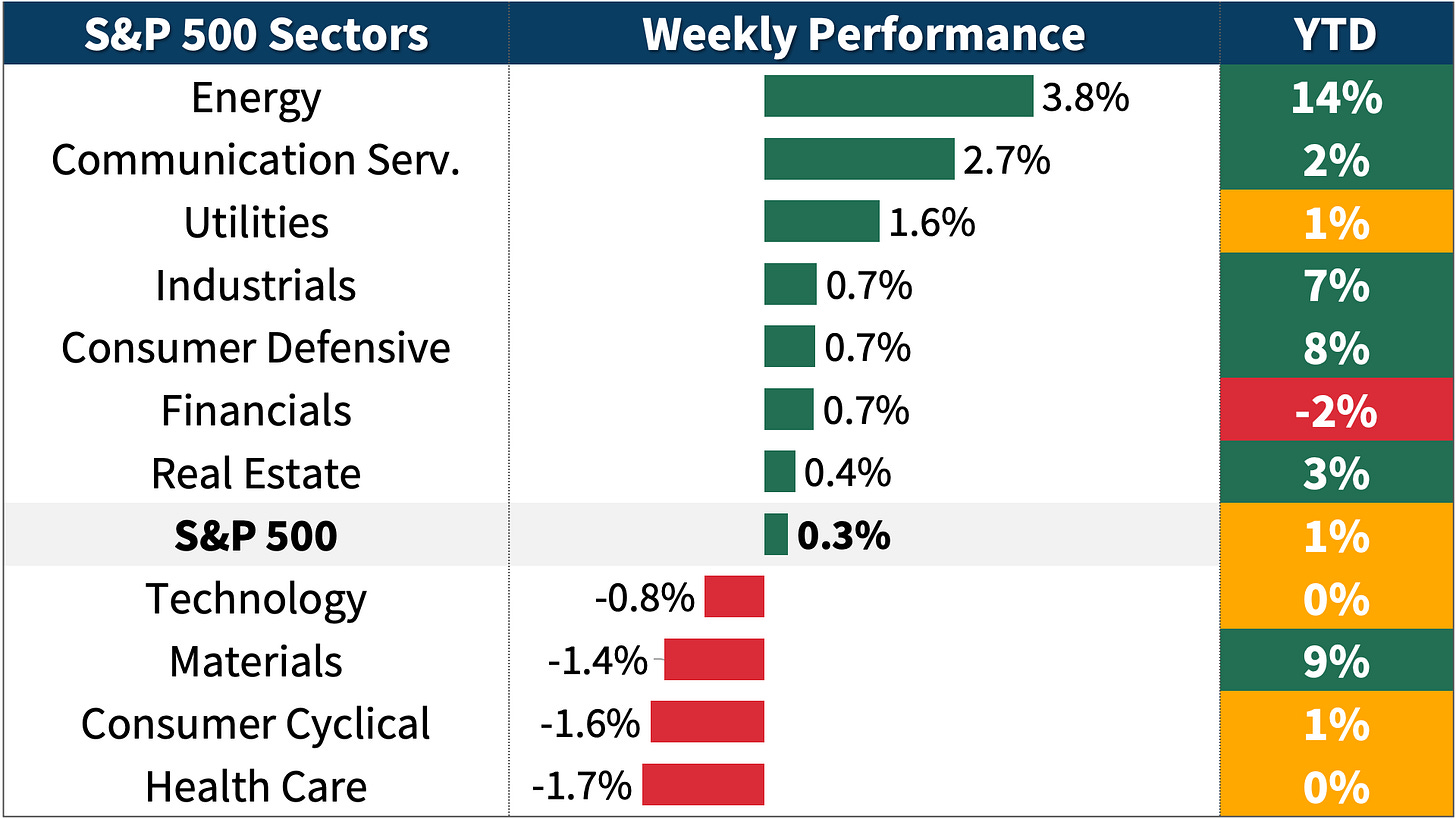 This week: 7 of the 11 sectors advanced. Energy (3.8%) was the best performer, while Health Care (-1.7%) was the weakest.