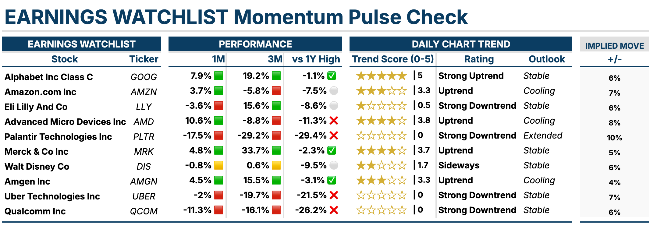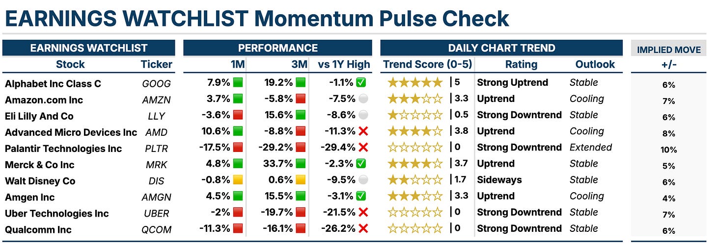 Below are notable stocks reporting earnings next week, along with my Momentum Pulse Check snapshot and implied volatility for the upcoming week.